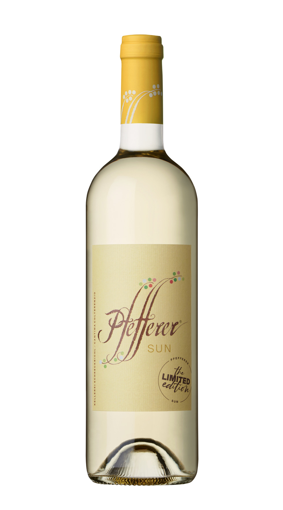 Colterenzio Pfefferer Sun: aromatyczne białe wino z Tyrolu Południowego, z Goldmuskateller. Słomkowo-żółte, pachnie muszkatem, bzem i cytrusami. Świeże i trwałe, idealne jako aperitif, do ryb lub kuchni azjatyckiej. Podać w 10-12°C.